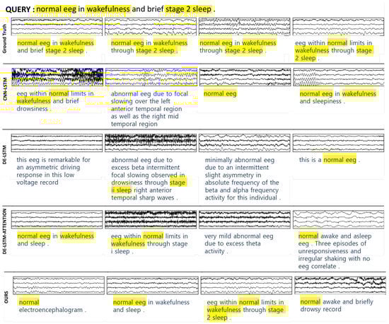 For the query “normal eeg in wakefulness and brief stage 2 sleep” showcased in Figure 5, the proposed method in this work accurately indexes normal signals exhibiting both wakefulness and stage 2 sleep. These results are presented in each column. Contrarily, the baseline methods misinterpret some abnormal signals as normal. In the case of an abnormal EEG, as represented in Figure 6, the query “abnormal eeg due to: low voltage suppressed background. absence of reactivity or variability” is utilized. The proposed method accurately retrieves the precise signal displayed in the rightmost column, whereas the baseline methods return signals which only partially match the query sentence.