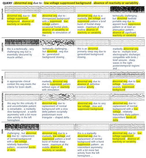 In the experiments, retrieval results were compared using NDCG, a commonly used metric for evaluating search engines, as described in Section 3.4. The proposed method in this work outperforms the baselines in terms of indexing EEG signals. Moreover, the t-test shows that the proposed method in this work significantly exceeds the retrieval performance of the baselines. Furthermore, retrieval samples for queries searching for normal eeg and abnormal eeg are provided in Section 3.5. As shown in this section, the proposed method generates more plausible sentences compared to the baselines. Finally, the ability of text generation is compared in Section 3.6. The BLEU scores demonstrate that the proposed method significantly outperforms the baselines in terms of text generation.