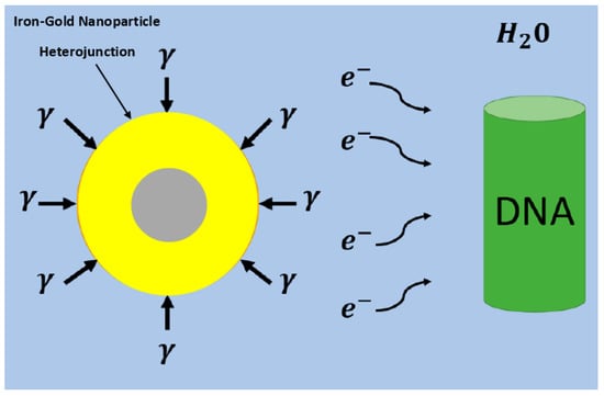 Schematic diagram showing the Monte Carlo experimental geometry for the iron-gold nanoparticle heterojunction irradiated by 50–150 keV photon beams (gamma rays).