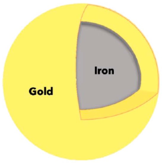 Schematic diagram of the iron-gold nanoparticle heterojunction with gold on the outer layer and the iron embedded inside.