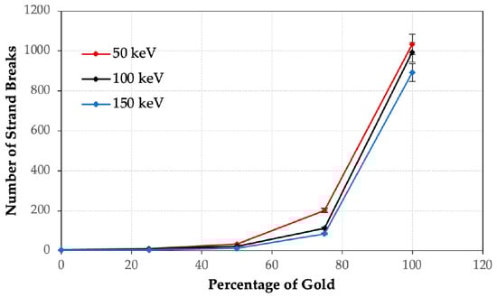 Relationship between number of strand breaks and percentage of gold in iron-gold nanoparticle heterojunction at different photon beam energies.