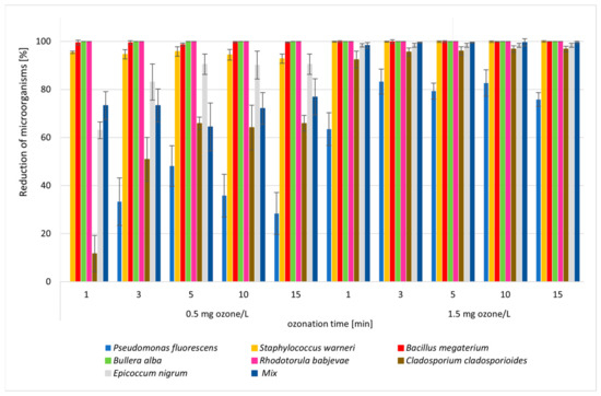 For all bacterial and fungal isolates, we determined the frequency of isolation in the pool of all isolated bacteria/fungi [%]. To assess the effectiveness of ozonation, the following isolates with the highest isolation frequency (>20%) were selected: bacteria Pseudomonas fluorescens; Staphylococcus warneri; Bacillus megaterium; yeasts Bullera alba; Rhodotorula babjevae; molds Cladosporium cladosporioides; and Epicoccum nigrum.