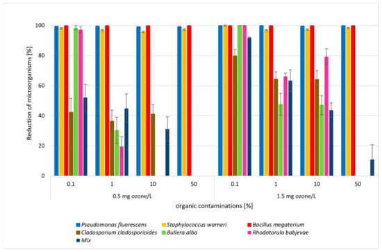 Reductions in numbers of microorganisms after 15 min of ozonation with different concentrations of ozone (0.5 mg and 1.5 O3 mg/L) and organic compounds (0.1%, 1%, 10%, 50%).
