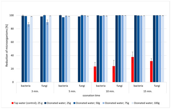 Previous model studies have proven that high microbial inhibition rates can be obtained by aqueous and gaseous ozonation, including pathogens Shigella sonnei, Escherichia coli O157:H7, Salmonella Typhimurium, Yersinia enterocolitica, and natural microflora [23,56,57,58,59,60]. However, there have been few studies on parsley leaves. Our studies on parsley isolates confirmed the effectiveness of ozonation in removing microorganisms from water. On the other hand, ozone may have some harmful effects on different plant products, such as losses in color, antioxidant constituents, etc., due to its strong oxidizing activity [61,62,63]. Therefore, in the next stage of this study, we investigated the dose and ozonation time determined under model conditions (1.5 mg/L, 3, 5, 10, 15 min), simulating the process in an industrial plant. During ozonation, the reduction in bacteria and fungi on parsley was measured in relation to the control (before the process). Different weights of parsley were used (25, 50, 75, 100 g). The control sample was parsley rinsed in tap water. The results are presented in Figure 4 and Table S3.