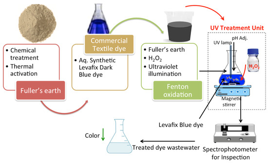 A stock solution of 1000 ppm was prepared from Levafix Dark Blue, and a further dilution was carried out when needed to obtain 50, 100, 150, and 200 ppm. Initially, 100 mL of the 100 ppm of Levafix Dark Blue dye-containing aqueous solution was poured into a glass container to subject it to the photocatalytic test. Then, a certain amount of Fuller’s earth augmented with hydrogen peroxide (30% w/v) supplied by Sigma-Aldrich (Burlington, MA, USA) was poured into a container as the source of the Fenton photocatalyst and placed in a photochemical reactor. The mixture was magnetically stirred and kept under UV illumination after the pH was adjusted, if desired (using AD1030, Adwa instrument, Szeged, Hungary), over the range of 3.0 to 8.0. The pH of the dye aqueous solution was adjusted to the desired values by using diluted H2SO4 (1:9) and/or 1M NaOH solutions (Sigma-Aldrich). All chemicals were used as received from the supplier without further treatment or purification.
