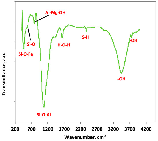 The morphologies of the attained Fuller’s earth sample were explored and imaged using a field-emission scanning electron microscope (FE-SEM) (FE-SEM, Quanta FEG 250, Technical Cell, Kolkata, India). The typically used magnifications were ×8000 and ×60,000. Furthermore, this instrument was supplemented by energy-dispersive X-ray spectroscopy (EDX) in order to assess the content of principal oxides in the Fuller’s earth. The oxides were examined via the energy-dispersive spectrum. Moreover, a Fourier transform infrared FTIR spectrum was obtained using the Jasco FT/IR-4100 model type (Jasco Inc., Mary’s Court Easton, MD, USA).