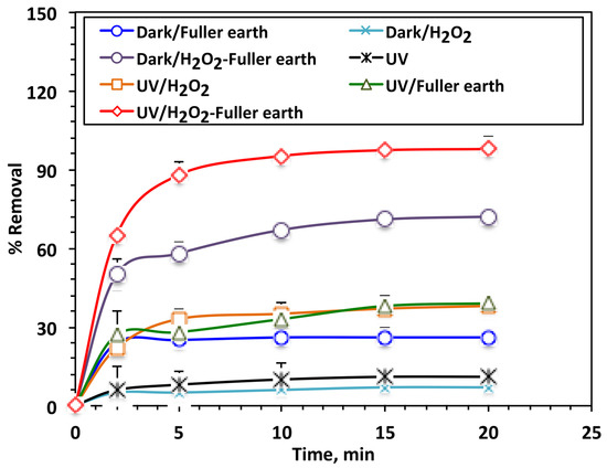 The effects of various treatments based on oxidation systems, namely, Dark/Fuller earth, Dark/H2O2, Dark/H2O2-Fuller earth, UV/H2O2, UV/Fuller earth, and UV/H2O2-Fuller earth, were explored to test the effect of the Fenton reaction tendency using Fuller’s earth as a catalyst. The efficacy of these techniques was assessed in terms of Levafix Dark Blue dye color removal, and the results are exhibited in Figure 5. The data compare the Levafix Dark Blue oxidation using the different systems at room temperature. It is clear from the data in Figure 5 that the solo H2O2 oxidation system results in the dye having oxidation efficiencies of only 7% and 38% in the dark and under ultraviolet illumination, respectively, within 20 min of the reaction time. Moreover, in the dark test and under UV illumination, the solo Fuller’s earth catalyst reached removal efficiencies of 26 and 39%, respectively. However, under the solo UV illumination system, the dye oxidation reached a removal rate of only 11%. In contrast, the augmented Fuller’s earth with hydrogen peroxide oxidative treatment could mineralize the dye to attain rates of 72 and 98% in the dark and under UV illumination, respectively. It is worth mentioning that the photo-Fenton system based on Fuller’s earth augmented with hydrogen peroxide achieved the highest oxidation among the investigated oxidation systems. Notably, the high removal rates of the Fenton system or the photo-Fenton system compared to those of the solo hydrogen peroxide systems or the Fuller’s earth systems verify the role of the Fenton reaction in eliminating dye molecules. The presence of dual reagents might explain this in the Fenton system, as they support the generation of more hydroxyl radicals. Moreover, the presence of ultraviolet light results in further hydroxyl radical production, which is the main responsibility of the oxidation system. This reaction trend was previously reported by Thabet et al. [13], who treated contaminated dye effluent using a modified Fenton system.
