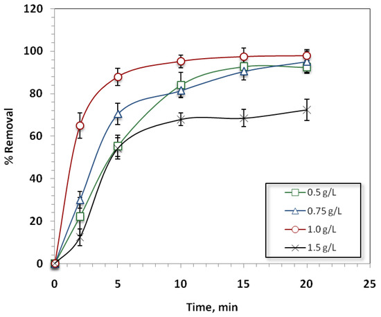 Each of the experimental parameters affecting the kinetics of the reaction was investigated, starting with the experimental reaction time. In this experiment, the influence of the oxidation system was examined in terms of the photo-Fenton oxidation reaction based on Fuller’s earth natural clay. In order to examine the optimal reaction time and its impact on the oxidation process, experiments were undertaken with illumination times ranging from 2 to 60 min. All other parameters, including the initial concentrations of Fuller’s earth and H2O2 at 1.0 g/L and 800 mg/L, respectively, were kept constant, and the solution pH was maintained at 3.0. Figure 4 demonstrates the influence of the reaction time on the profiles of various reactive azo dye loadings. An investigation of the results in Figure 4 indicated that the dye oxidation rate reached 73% within only the initial two minutes of the illumination time. However, afterward, it steadily declined, achieving an accumulative oxidation efficacy reaching 97% within 15 min when the initial azo dye concentration was 50 mg/L. According to the previously cited literature [16,20], azo dye molecules compromise aromatic rings. The hydroxyl radicals generated from the reaction of Fuller’s earth with hydrogen peroxide attack such rings and open them. Then, this generates reaction intermediates and eventually oxidizes them to harmless end products (CO2 and H2O). Initial rapid oxidation was dominant for all the dye concentrations. As the reaction proceeded, the generated hydroxyl radicals in the reaction medium gradually declined, corresponding to a reduction in the H2O2 concentration. Moreover, radicals other than hydroxyl radicals were produced, and they inhibited the oxidation reaction rate rather than improving the dye removal rate. The previous conclusion by [13] confirmed this investigation by treating various dyes contaminating wastewater effluent.