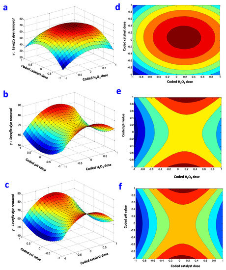 The 3-D (a–c) and 2-D (d–f) surface and contour plots of the coded independent variables and their responses in Levafix Dye removal: (a) H2O2 and Fuller’s earth catalyst concentrations; (b) H2O2 concentration and pH; (c) Fuller’s earth catalyst concentrations and pH.