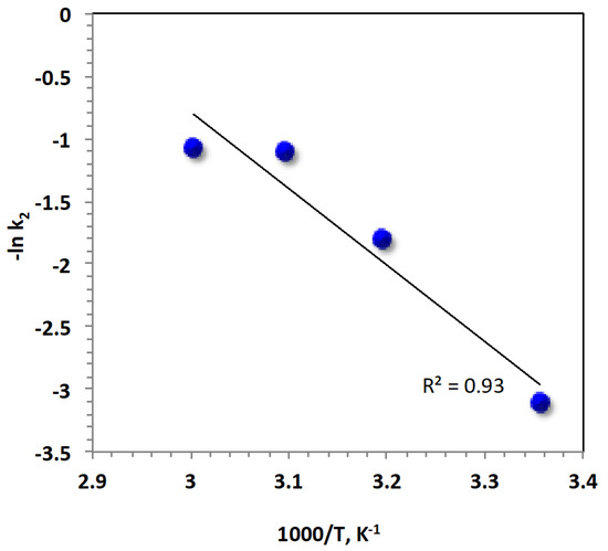 To fully understand the modified Fenton reaction based on the use of Fullers’ earth oxidation to oxidize Levafix dye molecules, thermodynamic parametric data were quantified. Arrhenius formula was used to investigate the activation energy, , with the activation energy (Ea) of the Levafix dye oxidation being based on the second-order kinetic constant, where R is the gas constant (8.314 J mol−1K−1), T is the temperature in kelvin, and A is the pre-exponential factor that is considered to be constant with respect to temperature [32]. Taking the natural log of the Arrhenius formula yields the following:
