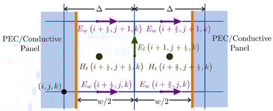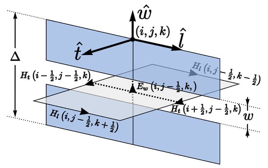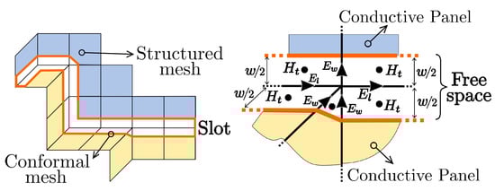 The aperture is determined by the cells centered on the magnetic-field components. Consequently, the electric fields are aligned across the slot (), and the magnetic fields are arranged transverse to its gap (), as depicted in Figure 1.