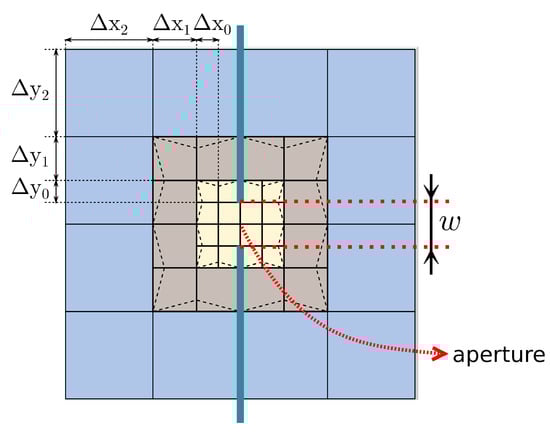 The SG method used in this work [,] is based on dividing each FDTD cell using a 1:2 refinement ratio, which is applied recursively, resulting in multiple subgrid levels. Each subgrid level consists of cells with half cell size of the adjacent level (see Figure 4). To handle narrow apertures, the aim of this method is to position the aperture within the finest grid (with higher resolution). With a number of subgrid divisions, the aperture is resolved with a cell size times finer than the coarsest one.