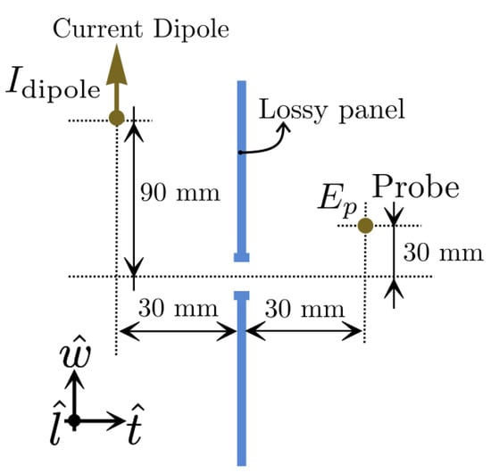 This paper employs DMMA, CA, and SG to analyze slots drilled in PEC plates and carbon fiber composite (CFC) panels. For the CFC panels, a convenient subcell model is assumed, treating them as finite-conductivity bulk thin panels (typically tens of kS/m) with a thickness smaller than the cell size. In this work, we have used the Subgridding Boundary Condition (SGBC) techniques described in ref. [] to model this situation. However, it is worth noting that there are other different techniques based on an impedance model that are equally valid for the same purpose, as presented in the articles [,]. The SGBC method calculates the fields on both faces of the panel by conducting a full-wave 1D simulation inside the panel. For this purpose, the panel is meshed with a fine spatial step only along the direction normal to the panel. The size of this fine mesh is chosen to ensure a precise resolution of the wavelength and skin depth at the maximum frequency of interest within the panel [,]. Details for the extension of SGBC to CA can also be found in ref. [].