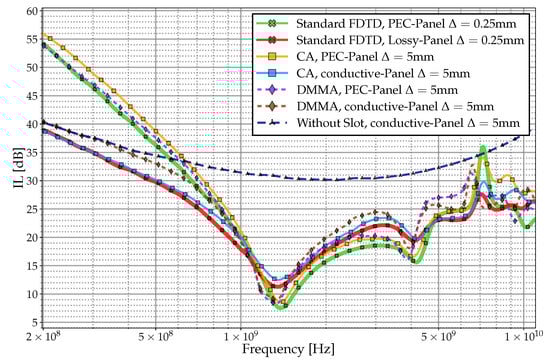 Figure 6 shows the results of the IL function for both a PEC and a conductive plane. The conductive plane is modeled using the SGBC method, with a conductivity of and a thickness of 1 mm. Note that the tendency of the conductive panel at low frequency (LF) (when the skin depth is greater than the thickness of the panel) is similar with and without the slot. However, above the first resonance, the slot response dominates the results. The convergence of the CA model and brute force at LF is similar to the conductive panel case. In our view, the observed differences with the DMMA model may be attributed to the fact that the DMMA model does not modify the surfaces affected by the slot, whereas the CA method naturally handles them in a conformal integral manner. This difference becomes particularly relevant when the slot dimensions are similar to the cell size. Notably, it is worth noting that this drawback does not appear for PEC panels, as the tangential electric fields are directly zero.
