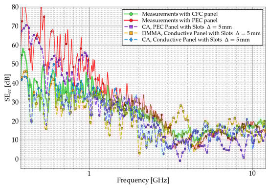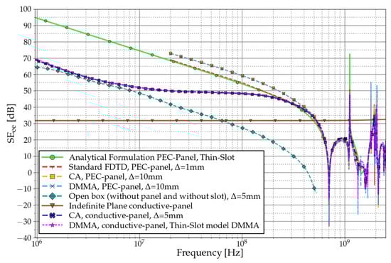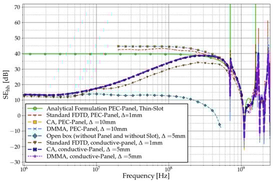 Electric field shielding effectiveness () evaluated at the central position of the rectangular enclosure. These results correspond to the Test Case shown in Figure 7.