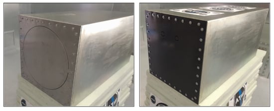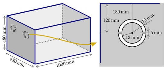 The final test setup evaluates the shielding effectiveness in a real test case proposed in ref. [], measured at INTA facilities in an RC, following the standards [,]. The box used in the experiments has dimensions of m (width), m (height), and 1 m (length), and it is primarily made of galvanized steel. One face of the box is removable, allowing for different material panels to be placed inside (Figure 10). In the first test case, the removable panel is made of aluminum and features two semicircular slots, as indicated in Figure 11. In the second test case (Figure 12), the panel is made of CFC material (referred to as CFC-“blue” in ref. [,]), and it has two pairs of semicircular slots. The box has been tested in the reverberation chamber at INTA facilities. This setup exposes the apertures to waves with all possible polarizations and directions of incidence. The metals like aluminum and galvanized steel are considered as PEC. The CFC material has a thickness of 2 mm, and we use a SGBC numerical model with an equivalent conductivity of at the frequencies of interest. To simulate the reverberating environment, we use a statistical superposition of plane waves, with random propagation and polarization [].