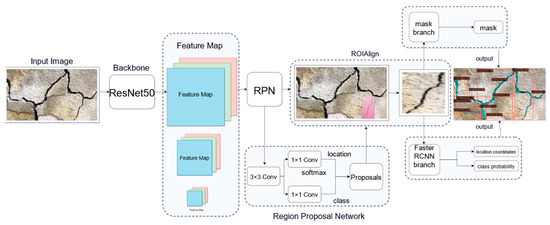 Mask R-CNN was first proposed by He et al. in 2017 [11], and has been widely used for crack detection. Tan et al. demonstrated that detectors based on Mask R-CNN provide a robust and feasible ability for detecting, in real time, cracks’ existence and their shapes [12]. Pan et al. demonstrated the satisfactory performance achieved by using Mask RCNN for scratch detection in architectural glass panels [29]. As mentioned above, it is a typical two-stage instance segmentation model, capable of localization and segmentation of detection objects at the same time. The overall flow of Mask RCNN is shown in Figure 1.