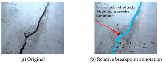 Theoretically, the continuity of a line means the curvature of the line near the breakpoint. The greater the curvature, the greater the probability that the two cracks before and after the breakpoint are different. The advantage of using relative breakpoint annotation is that the distinction of cracks is more in line with mechanics and human logic. In addition, relative breakpoint annotation makes objects of different scales in the dataset more balanced. Therefore, the predicted feature layers of each scale in the model and their generated proposals and anchors can be fully utilized to enhance the robustness of the model.