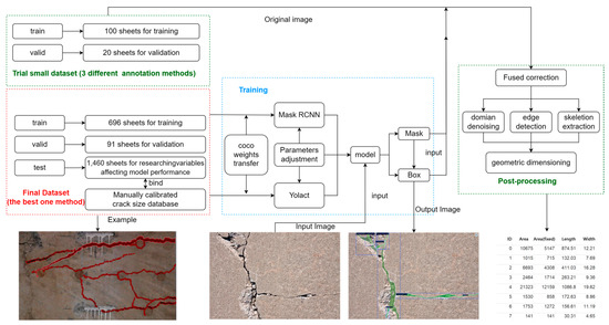 As mentioned previously, this section will be first to verify the performance of proposed relative-breakpoint-based crack annotation methods. The dataset contains 120 images, and 744 cracks are prepared for crack annotation using the three different mentioned methods, i.e., continuous crack annotation, absolute-breakpoint crack annotation, and relative-breakpoint crack annotation. The Mask RCNN is utilized for model training, and the mAP of bbox is used as an indicator to judge the best annotation method. The mAP of mask is used as a more precise indicator to measure the model after choosing the method. After that, the outperformed crack annotation method is then used to prepare another larger dataset, which contains 787 images for crack detection model training and evaluation, followed by the post-processing procedures to generate the dimensional information of detected cracks. The 787 images in the dataset contain 3794 crack objects, so each image contains more cracks and has high complexity, as the example picture shown in Figure 5 demonstrates. Thus, the dataset has sufficient complexity to complete the validation of the proposed method. Mask RCNN and Yolact are employed to further validate the accuracy of our method. The reason for selecting these two models is that they represent the two-stage instance segmentation and one-stage instance segmentation approaches, respectively. Validating our proposed method using these two models demonstrates its versatility. The overview procedures can be found in Figure 5.
