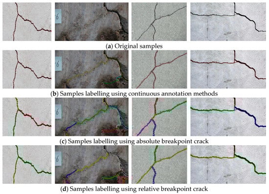 The counting criteria for cracks has a great influence on the model’s performance. The most difficult problem of counting and calibration is how to judge the boundary of multiple intersecting cracks. Taking Figure 3a as an example, different crack annotation methods, as indicated by Figure 3b–d, can seriously affect the crack-detection model’s training and performance. Therefore, we make a comparative analysis between continuous crack annotation methods, i.e., Figure 3b, and the absolute breakpoint annotation in the following subsections, i.e., Figure 3c. Based on the results of the analysis, a relative-breakpoint-based annotation strategy, as seen in Figure 3d, is proposed to delineate crack boundaries to create a high-quality crack instance segmentation dataset.