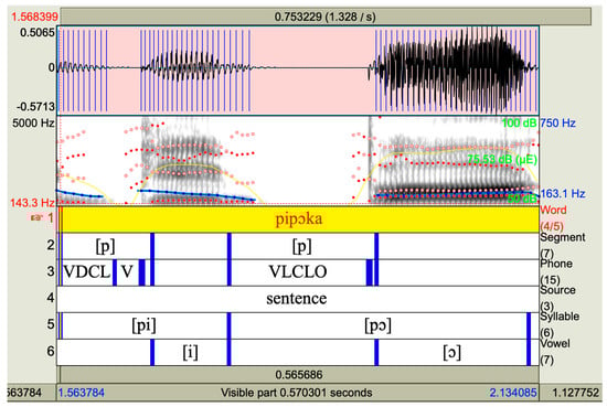 The main investigator manually settled all acoustic features of [p] from the sound wave and spectrographic inspections. The beginning of [p] was considered the ending of its preceding vowel, while the final boundary of [p] was the beginning of its following vowel. The vowel pulse, formant track, and perturbation on the sound wave were used as Campo instrumental acoustic cues [45] to settle vowel boundaries. The analysis settings as applied in Praat and the acoustic features of [p] are summarized in Table 3.