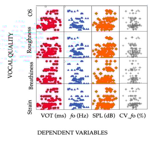 Scatterplot distribution of Voice Onset Time (ms) indicated as a red round symbol, fundamental frequency (fo) indicated as a blue triangle, sound pressure level (SPL) indicated as an orange diamond, and fundamental frequency coefficient of variation (CV_fo %) indicated as a grey cross, with the vocal quality parameters overall severity of dysphonia, roughness, breathiness, and strain.