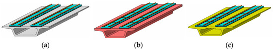 Schematics of a BGB with a thickened top plate in a high-speed railway: (a) initial; (b) whole top plate thickened; (c) top plate locally thickened under the track.