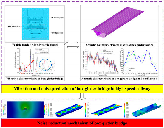 In this paper, firstly, based on the train-track-bridge interaction theory, the vehicle-track-bridge coupling dynamic models of three kinds of BGBs are established, which vibration characteristics by the external excitation are compared and analyzed. Secondly, taking the vibration response of three kinds of BGBs as acoustic boundary conditions, the acoustic boundary element method is adopted to predict the acoustic radiation characteristics of BGBs. Finally, the sound radiation mechanism of BGB is further analyzed by the vibration principle. The main research ideas are shown in Figure 2.