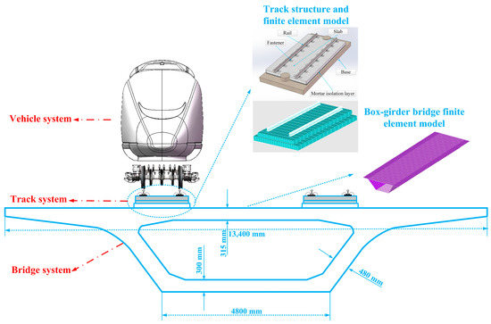 The subscripts v, t, and b represent the vehicle, track, and bridge structures, respectively; M, C, and K are the mass, stiffness, and damping matrices, respectively; , and are the displacement, velocity, and acceleration vectors, respectively; and F is the generalized load. The vehicle–track–bridge interaction model is shown in Figure 3. In the overall system, the vehicle submodel uses the classical 35-degree-of-freedom model. Each vehicle section includes a vehicle body, two steering racks, and four wheels sets, all considered to be rigid-body structures, connected by the first and second suspension systems; the suspension system exhibits linear and nonlinear characteristics. Each rigid body comprises lateral, vertical, side-roll, rocker, and nodding degrees of freedom; the vehicle model dynamic equations and related parameters are described in the literature [40]. The finite element model is used for determining the structure of the elevated infrastructure. The theoretical finite element model of the track and the BGB structure is shown in Figure 3. The relevant parameters and finite element type are shown in Table 1.