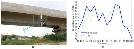 The sound pressure levels calculated and measured at a position 5 m directly below the bridge are shown in Figure 4. The results are in good agreement, and within the studied frequency band. Their trends of changing over time are consistent, and their peak values appear at similar frequencies. Therefore, the acoustic prediction model herein developed for BGBs is reliable.