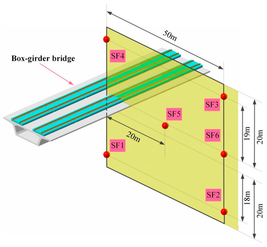 With the continuous increase in the speeds of high-speed train operation, the noise problem caused by high-speed railways is becoming increasingly prominent, aggravating the overall noise-related issue in various parts of the line. The noise of elevated high-speed railway lines covers the full frequency band; for example, wheel–track system noise, collector system noise, and aerodynamic noise are mainly concentrated in the middle and high-frequency bands, while the noise related to elevated concrete bridge sound radiation is mainly low-frequency. Therefore, elevated lines compared to other lines encounter a more prominent noise problem. In addition, due to the characteristics of low-frequency sound waves, acoustic waves will have a larger impact on human health and the ecological environment [1,2,3,4,5], so the problem of low-frequency acoustic radiation as associated with high-speed railway bridges is now a close concern of scholars from various countries.