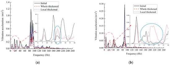 The vibration acceleration comparison of the top plat-thickening design schemes: (a) top plate center point; (b) bottom plate center point.