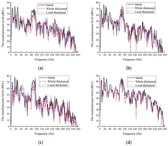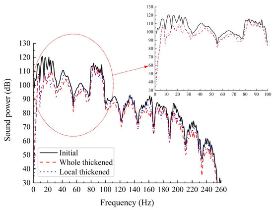 Different factors in the propagation process will affect the sound waves radiated by the BGB. The main principle is complicated. The sound pressure of different sound field receiving points is generated mainly by the superposition of the sound waves produced by the four plates of the BGB, and these are affected by noise reduction measures. Therefore, the overall acoustic radiation capacity of the BGB under different working conditions must be further analyzed. As such, the sound power is compared, from which the effectiveness of the top plate-thickening design aspiring towards low acoustic radiation can be judged, as shown in Figure 8. As can be seen from Figure 8, both design solutions involving thickening the top plates of the BGBs can significantly reduce the acoustic radiation capacity of the BGBs. In the lower frequency band, the noise reduction effects of the two design solutions are extremely close; however, with increased frequency, the noise reduction effect of the top plate-thickening design is better, but the difference is not obvious. Further, as the frequency increases, the effects of both solutions are also extremely similar in the severe vibration band.