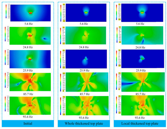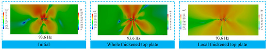 In addition, changing the vibration distribution of the BGB will also greatly impact the propagation of sound radiation, and changing the sound radiation pattern of the BGB is very significant, as shown in Figure 14. The vibration characteristics of the whole top plate and the remaining three plates of the BGB when under the three operating conditions and subjected to 27.1 Hz show that the local bending vibration of the top plate is significantly changed at this time. The number of bending waves in the top plate is reduced under both top plate-thickening schemes. Analyses of the remaining three plates against the same benchmark show that, compared with the initial BGB, the vibration in most of the remaining plates is significantly enhanced, and the vibration area increases, resulting in a gradual increase in the area of radiated acoustic waves, but a narrowing of the area of concentrated acoustic radiation. The amplitude of the acoustic radiation in the area above the BGB is thus significantly weakened, but no obvious pattern of acoustic radiation arises as a result. This shows that the vibration distribution of the BGB also has a significant effect on its sound radiation pattern. When subjected to the severe vibration band, the vibration of the BGB will be more complex. The sound radiation distribution will show no obvious pattern because vibration damping reduces the overall sound radiation amplitude, as shown in Figure 15.