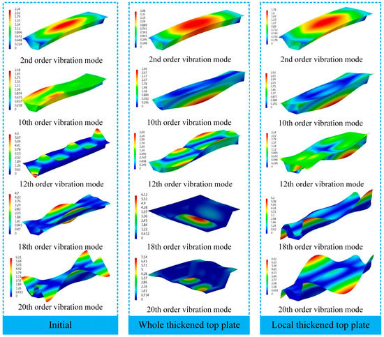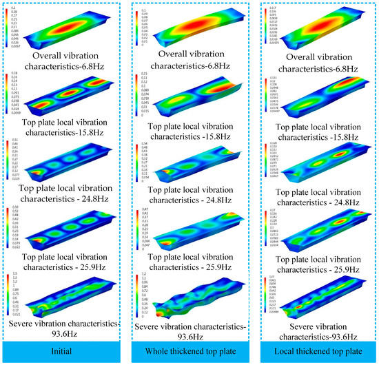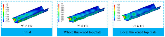 From Table 2 and Figure 10, it can be seen that there is a certain increase in the natural frequency of the BGB with a thickened top plate and in that of the BGB with a locally thickened top plate, at the same order, between the initial and the natural frequency of the BGB with its whole top plate thickened. The modalities of the first two orders of the BGB under the three conditions give the overall self-oscillation characteristics; the initial BGB shows more local self-oscillation characteristics in the top plate, including the (m, n) order vibration patterns, which have a greater impact on the low-frequency acoustic radiation capability of the BGB. The whole and local self-oscillation characteristics in the higher-order modes occur simultaneously in most cases, forming the overall local self-oscillation characteristics of the BGB, and the local vibration characteristics of the top plate are more prominent in comparison. In regard to the design of BGB top plate thickening, the biggest change in the low-order vibration pattern is that the local self-oscillation characteristics of the top plate are weakened. In contrast, the bottom plate will show local self-oscillation characteristics, which will occur in both thickening designs. The local self-excitation of the wing plate will be enhanced in the process of vibrational energy transfer. At the same time, thickening the whole plate has less of an effect on the vibration of the wing plate, and a more significant effect on the vibration of the bottom plate, because the top plate under the rail that is being thickened is located above the BGB cavity and the wing plate, respectively.