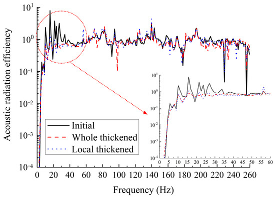 From the above analysis, it can be seen that thickening the top plate changes the low-frequency oscillation distribution of the BGB, and so resonance can be avoided to a certain extent through the transfer of vibration frequency, thus weakening the resonance and the consequential sound radiation. The modal acoustic radiation efficiency of BGBs at lower frequency bands has a significant effect on their acoustic radiation capacity. According to the literature [11], when the local vibration in the top plate dominates the BGB’s overall vibration, the plate would ideally be thin. Therefore, by changing the (m, n) order vibration pattern of the top plate of the BGB, the modal acoustic radiation efficiency of the BGB is suppressed. Thus, the overall acoustic radiation efficiency of the BGB is weakened, as shown in Figure 13. Therefore, the vibration of the two kinds of top plate-thickened BGBs, as a result of small-vibration-peak sound radiation, can be limited to the lower frequency by changing the vibration distribution of the BGB in the noise control design. Changing the vibration distribution is the most critical factor in controlling the lower-frequency band noise of the BGB.
