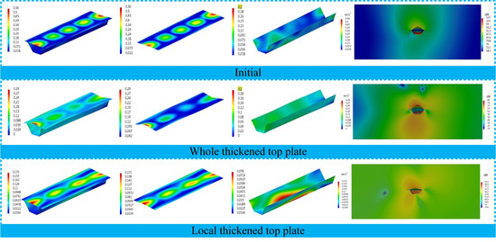 In summary, this paper explores the key issues involved in designing bridge plate thickening as it relates to noise reduction by comparing and analyzing the acoustic vibrational characteristics of the initial BGB, the BGB with its whole top plate thickened, and the BGB with under-rail local thickening. The thicknesses of the top plates in both designs are twice that of the initial BGB, and the remaining parameters are kept the same. The initial BGB and the designs with top plate thickening are shown in Figure 1.