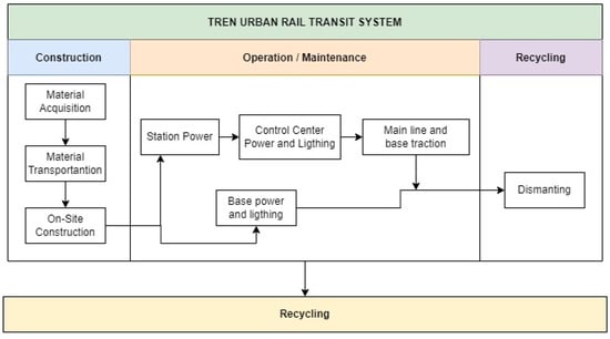 This study aims to utilize a life cycle assessment methodology to establish the system boundaries of an urban rail transit system. It involves conducting an inventory of resource inputs (such as materials, fuels, and equipment) and emission outputs based on real observed data from the Pernambuco Metro. The obtained results will then be compared with findings from other similar case studies inside Brazil. The urban rail transit system comprises various components, including tracks, tunnels, viaducts, power facilities, vehicle depots, stations, vehicles, and control centers. The calculation process will encompass determining the resource inputs and greenhouse gas (GHG) emission outputs for each phase, as illustrated in Figure 2.