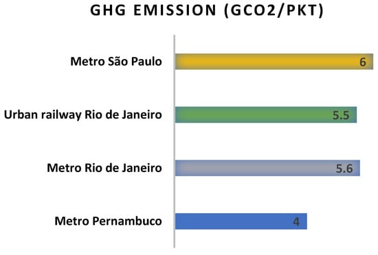 Greenhouse gas (GHG) emissions in railway systems can vary considerably due to various factors that affect the operation and infrastructure of these systems. One of the main influences is the type of energy used to power the trains, which has a significant impact on the total emissions of the railway system [,]. In the case of the Pernambuco subway, it stands out from other systems compared in this article because it uses a combination of electric and diesel energy, with the latter being a fossil fuel with high GHG emissions.