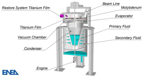 More in detail, the assembly depicted in Figure 1 is composed of the rotating target and its auxiliary components (i.e., vacuum chamber, reservoir, etc.). The rotating target has a double scope, allowing the implantation of deuterium and tritium into a thin titanium layer (about 3 μm) properly deposited on the target surface and dissipating the thermal power (250 kW) delivered by the accelerator.