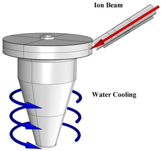 As can be seen from Figure 2 the ion beam is inclined with respect to the external surface of the evaporator. Due to the projection onto it, the footprint of the ion beam (150 mm) is different from its diameter (about 100–120 mm).