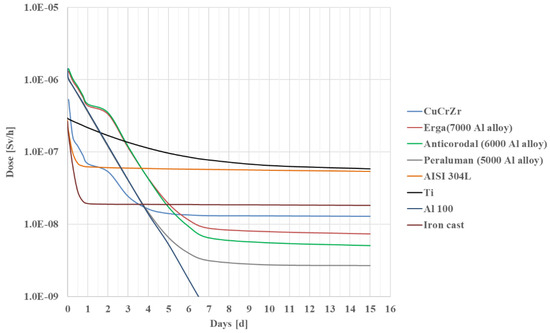 The aluminum alloy showed the lowest material activation as reported in Figure 5.