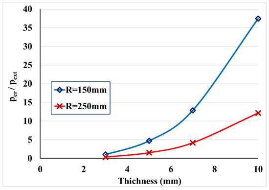 Normalised pressure of instability for different wall thicknesses.