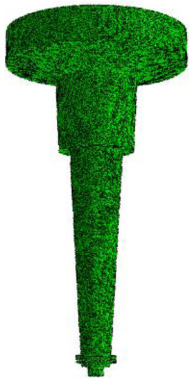 Four-node thermally coupled tetrahedron, linear displacement, and temperature elements named C3D4T were chosen to build the mesh. After element type and average size, a mesh with more than 3 million (3,054,114) elements with a maximum length of 8 mm, able to ensure the accuracy of results, was built and employed for the calculations. The 3D model for the target is shown in Figure 7.