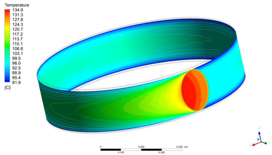 Thanks to all these assumptions, a transient RANS thermal–hydraulic simulation was performed on the heated region of the rotating target [6] to highlight the periodic temperature profile on the external surface of the evaporator to adopt as BC for the mechanical simulations. The time step selected for the simulation grants a Courant number lower than 1 (0.82) for the stability of the numerical simulation. The contour plot of the thermal field on the external surface of the rotating target is reported in Figure 8; the maximum temperature, about 135 °C, was located in the area exposed to the beam spot while a kind of “comet effect” was highlighted downstream of it thanks to the cooling effect of the boiling water inside. The cold spot of about 98 °C was located at the opposite side just upstream of the beam footprint.
