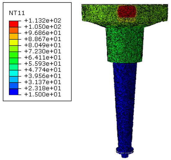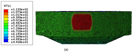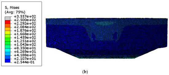 Figure 10 shows numerical results for the configuration without internal stiffeners. In particular, Figure 10a shows the temperature field, while Figure 10b the von Mises stress distribution, respectively.