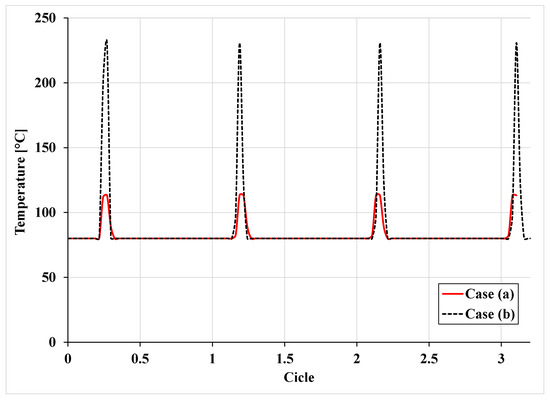 Comparison in terms of the temperature for case (a) and case (b) for the different number of cycles.