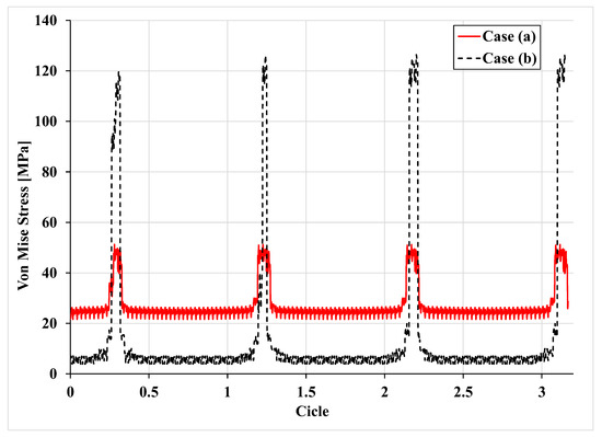 Comparison in terms of von Mises stresses for case (a) and case (b) for the different number of cycles.