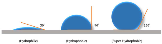 Figure 3, is the angle measured on the inside of the liquid between the liquid–gas interface and the liquid–solid interface. Therefore, when cohesion is dominant, the contact angle increases (close to a sphere), and when adhesion is dominant, the contact angle decreases (spreads widely). When a liquid exhibits a small contact angle and spreads completely on the solid surface, it is referred to as hydrophilic, and significant wetting occurs. The solid surface is said to be hydrophilic. On the other hand, when the liquid exhibits a large contact angle, with minimal wetting occurring on the solid surface, and water droplets roll on the surface, it is referred to as super-hydrophobic. In this case, the liquid exists as separate nearly spherical liquid droplets on the solid surface [