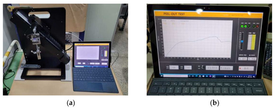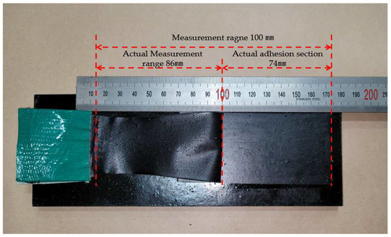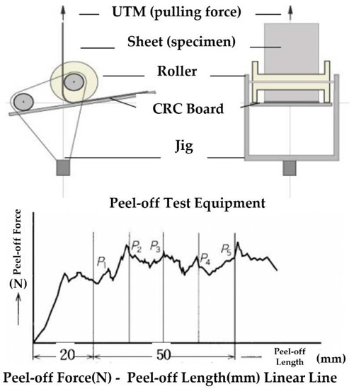 Figure 5. The test specimen is passed through a sliding jig, and one end that is not adhered to the test substrate is fixed to the tension testing device, ensuring a peel angle of 90 ± 5°. The sheet is then peeled by 20 mm, excluding the initial peel length, and gradually pulled at a tensile speed of 100 mm/min.